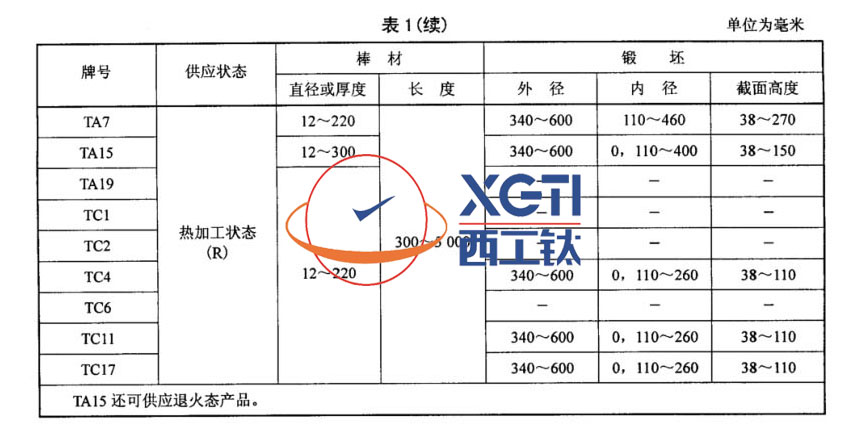 棒材和鍛坯牌號(hào)、狀態(tài)和規(guī)格應(yīng)符合表1的規(guī)定。其中TA15鈦合金棒材根據(jù)用途分為兩個(gè)類別: