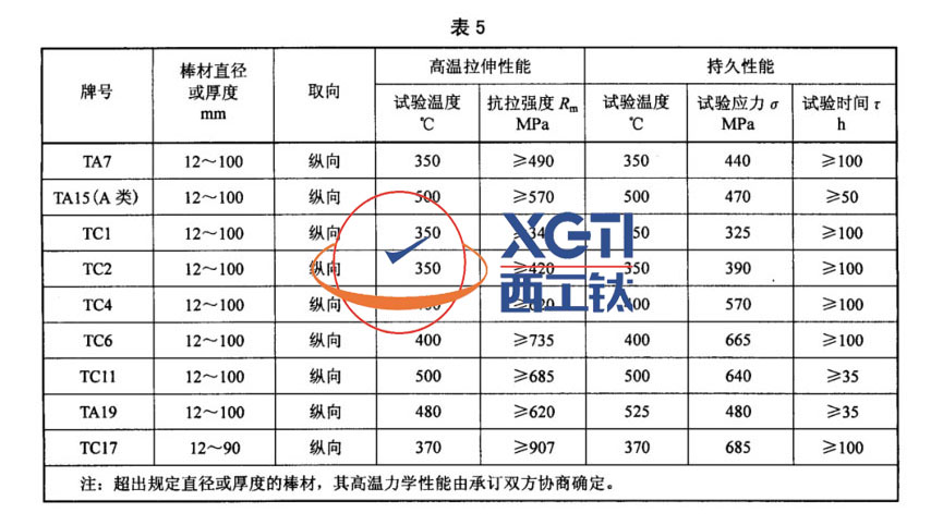 3.4.3 訂購(gòu)方要求并在合同中注明時(shí),鈦合金棒材的高溫拉伸、持久性能應(yīng)符合表5的規(guī)定,TA19和TC17鈦合金棒材的熱穩(wěn)定性和高溫蠕變性能應(yīng)符合表6的規(guī)定。